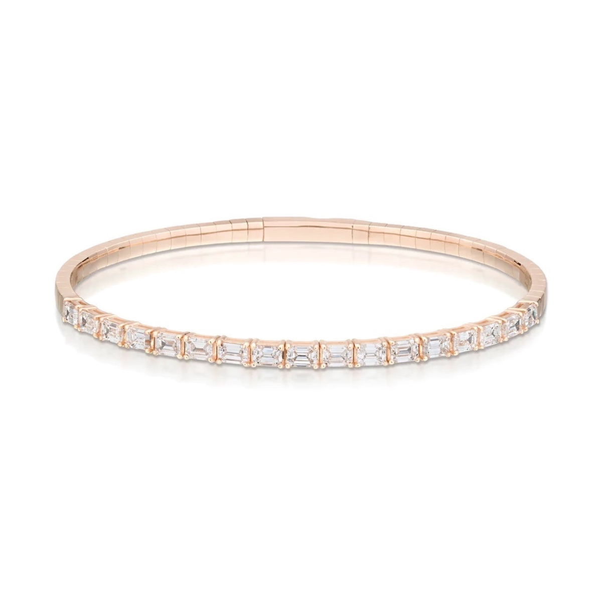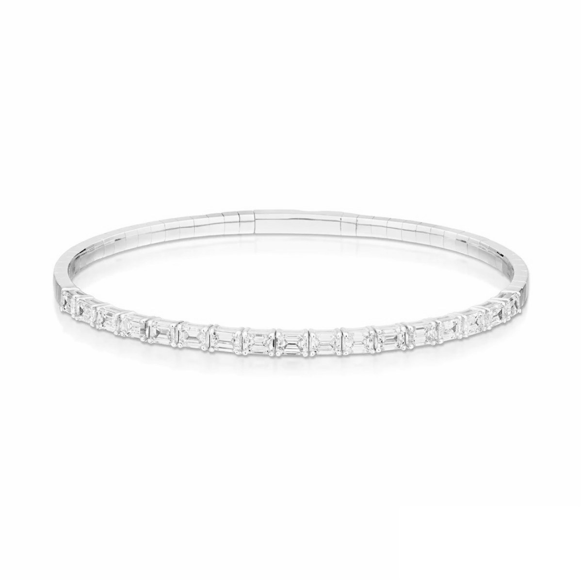 An exquisite and versatile emerald-cut flexible bracelet, crafted to perfection with precision-cut emerald stones that effortlessly intertwine, creating a graceful and adaptable piece that radiates timeless sophistication.