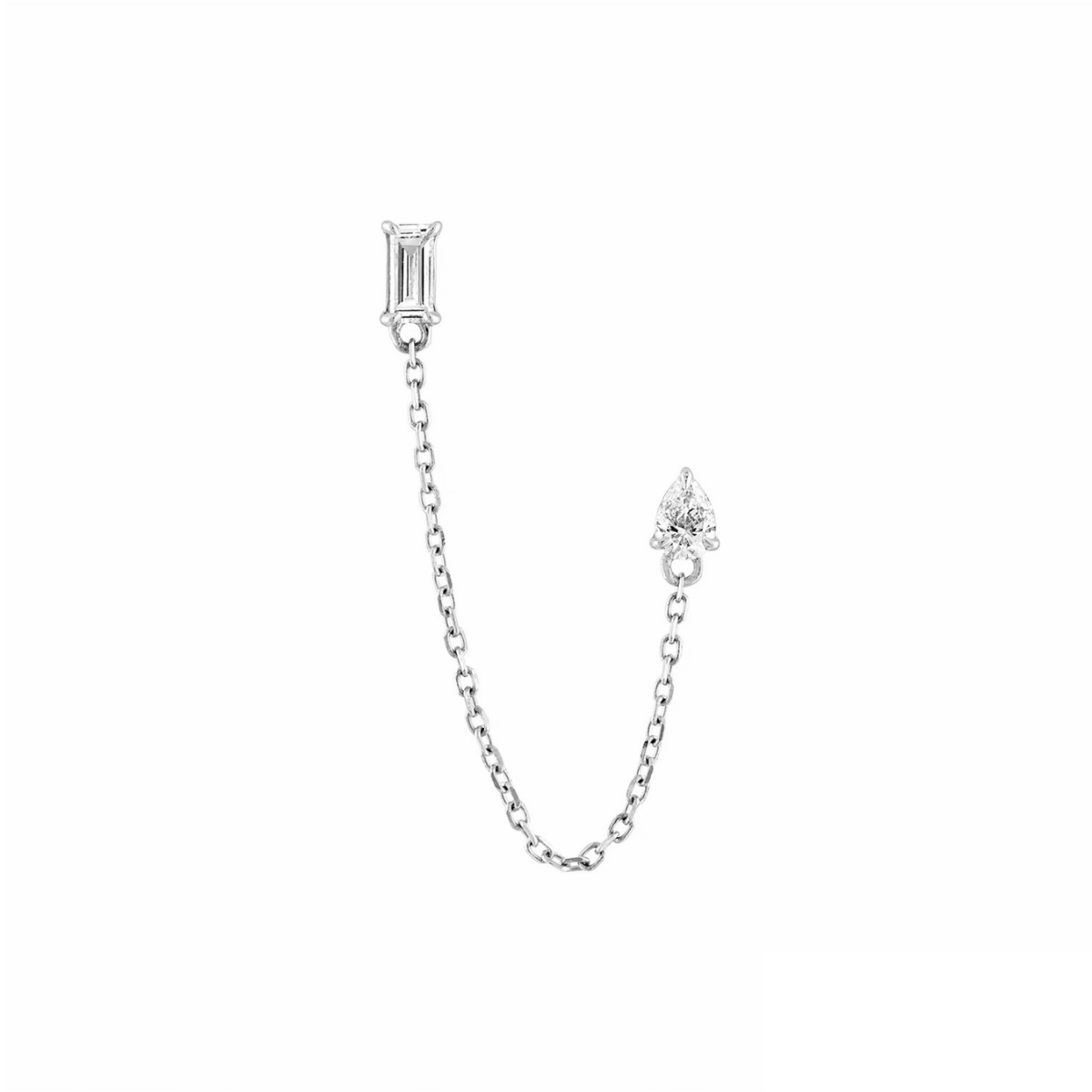 Experience the epitome of elegance with our Diamond Pear Shape/Emerald Cut Chain Earrings. A harmonious blend of sophistication and modernity, these earrings showcase pear-shaped and emerald-cut diamonds gracefully dangling from a delicate chain. The unique design captures the light at every angle, creating a stunning interplay of brilliance. Elevate your look with these distinctive earrings, a perfect balance of classic and contemporary charm, reflecting your individual style with every sway.